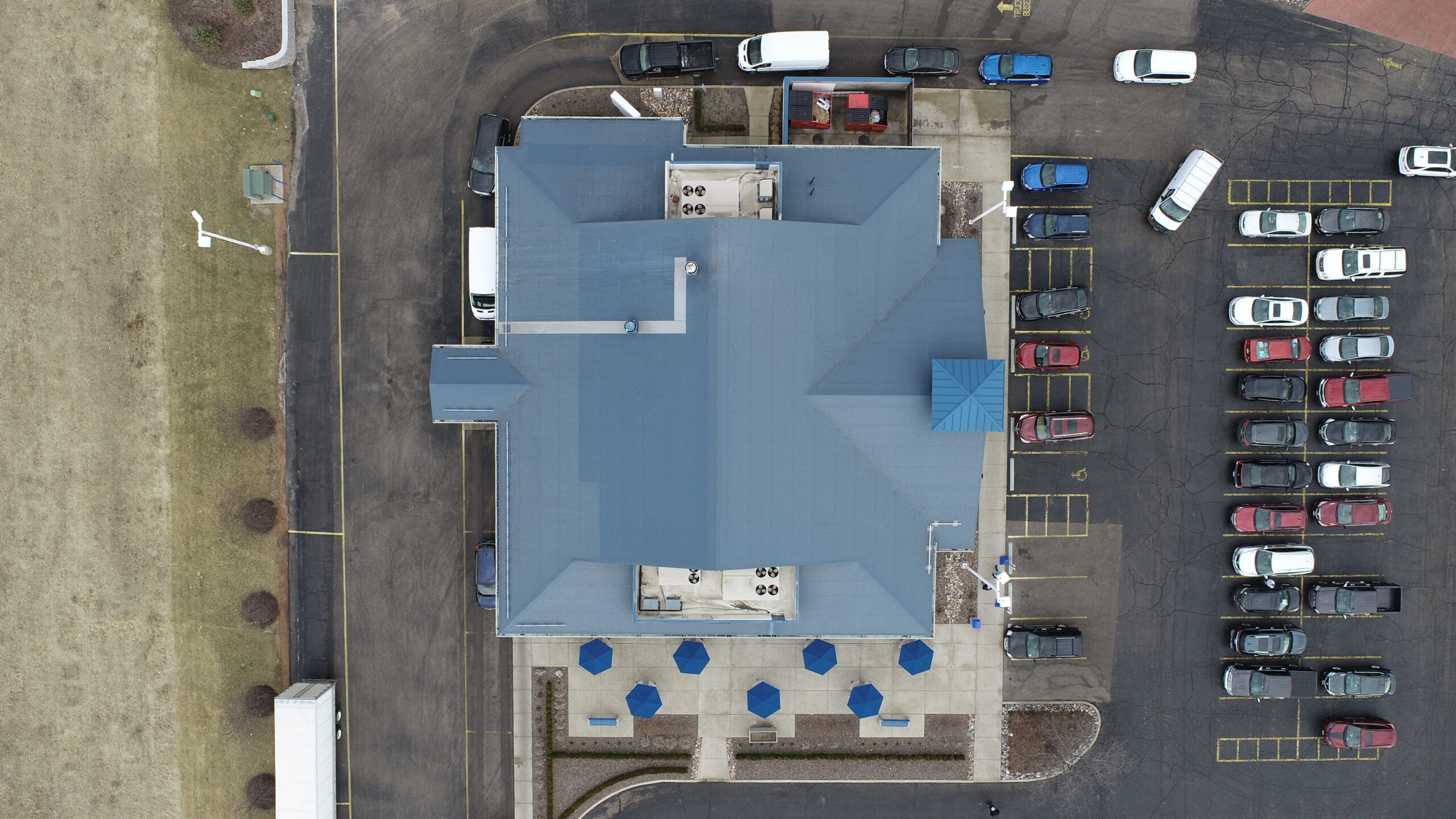 Safety during roof inspections was a main consideration while planning for the membrane roof on steep slope. As seen in the overview photo above, the owners of this Culvers chose to install a safety walkway from the edge to the kitchen exhaust vents.